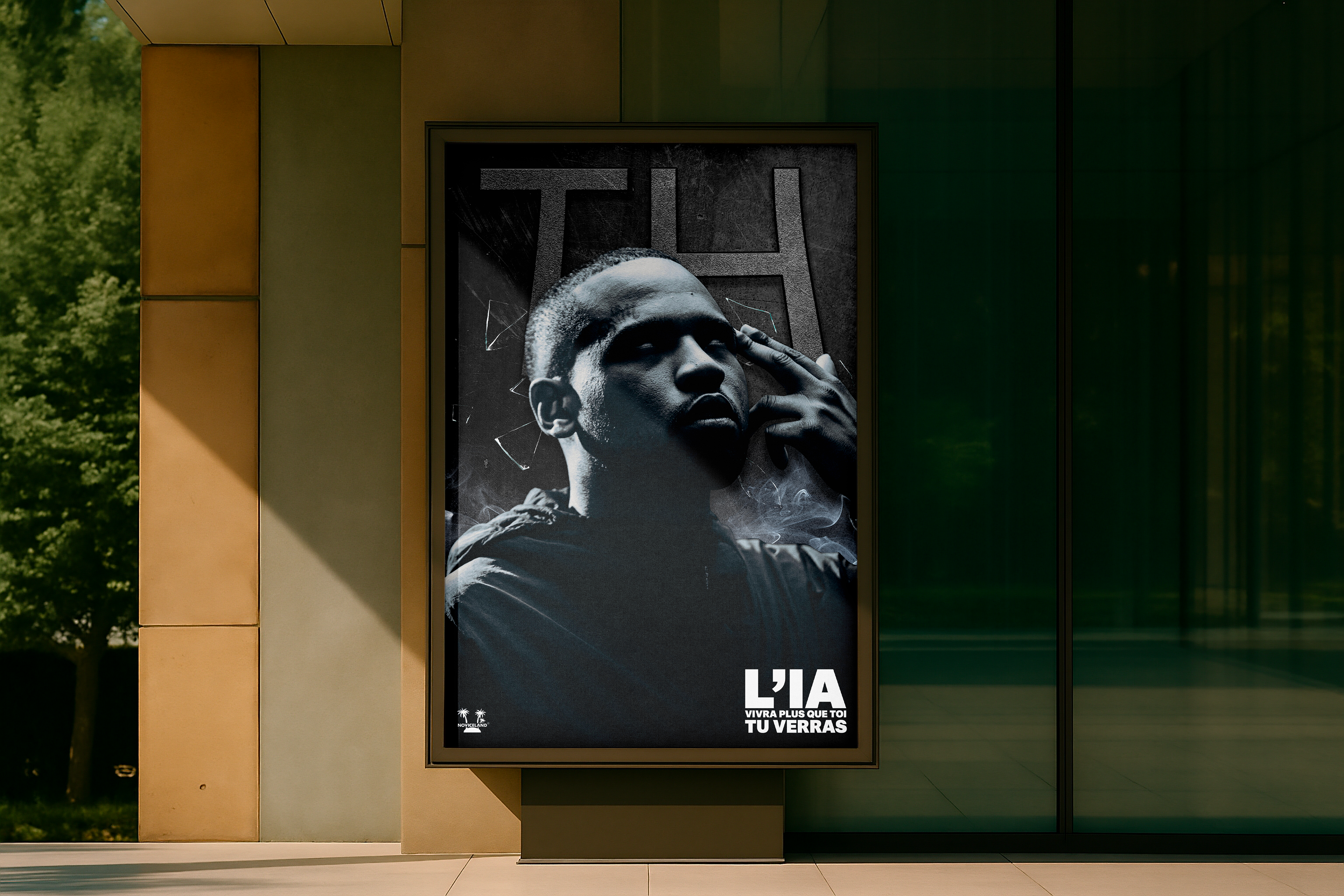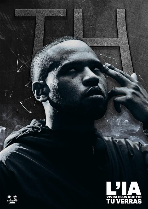 Pour TH, j'ai choisi une approche plus cinématographique et introspective. L'affiche est réalisée en noir et blancavec un jeu d'ombres très prononcé et une lumière dirigée qui met en valeur l'expression de l'artiste. Des éléments subtils comme les fragments de verre brisé et la fumée légère ajoutent du drame. Le message ('L'IA VIVRA PLUS QUE TOI TU VERRAS') est positionné en bas, comme une signature sérieuse et réfléchie, cohérente avec son rap souvent engagé ou philosophique."