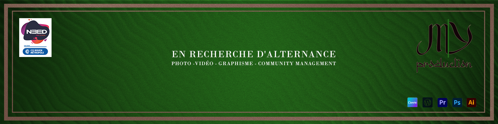 Mon identité visuelle est construite autour d'une charte graphique distinctive dominée par le vert foncé et profond, Le logo MY Production est basé sur le diminutif de mon prénom, ce qui lui confère une dimension personnelle et authentique. Il représente mon univers créatif et ma volonté d’exprimer ma personnalité à travers le design. La composition joue sur l’équilibre entre élégance et originalité, symbolisant à la fois la rigueur et la liberté artistique qui caractérisent ma démarche. Ce vert est mis en contraste par le noir de la photo de profil, qui apporte sobriété et sérieux.